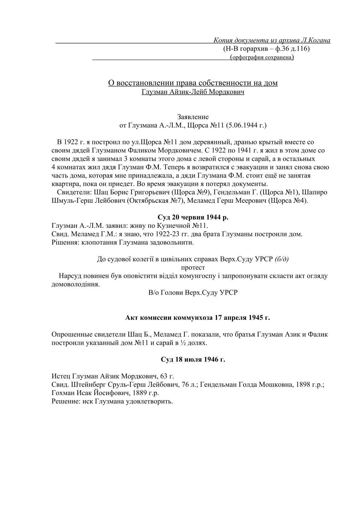 Восстановление права на дом Айзика Глузмана